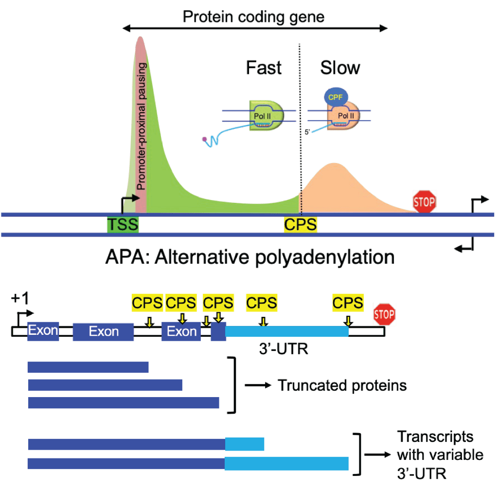 To investigate the coupling of transcription elongation and co-transcriptional processes – The variations in the rate of Pol II elongation have been implicated in controlling co-transcriptional processes such as 5′- and 3’-end processing, antisense transcription, alternative polyadenylation (APA), and splicing of pre-mRNA. However, much is still unknown, how the elongation rate is controlled and, consequently, the coupled process. The current hypothesis is that normal speeds of Pol II elongation favor the recruitment of factors necessary to execute a particular step, whereas slower Pol II promotes aberrant recruitment of factors, resulting in premature outcomes; conversely, faster rates impair the timely execution of exact steps. The primary objective here is to examine unidentified and uncharacterized connections among kinase-phosphatase antagonisms, rate of elongation, post-translational modifications (PTMs) of histones, pre-mRNA splicing, and transcription polarity.
