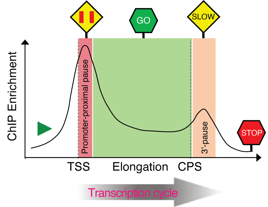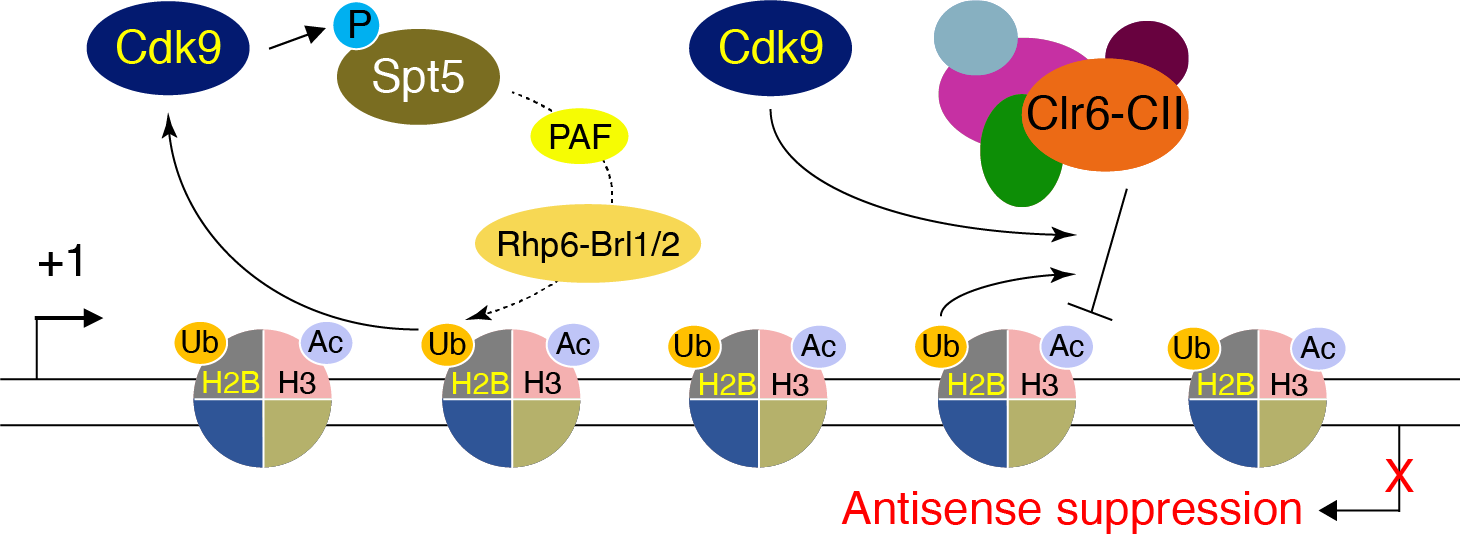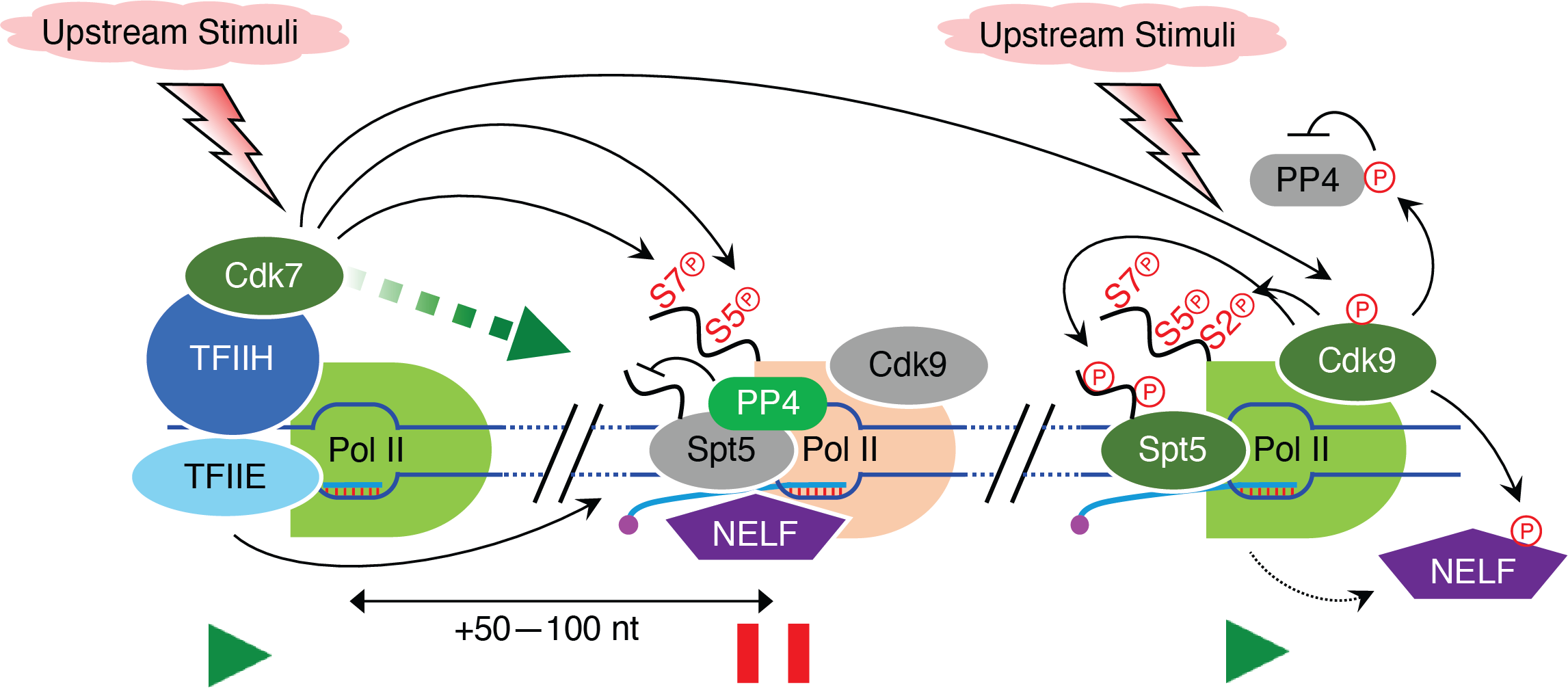 To obtain mechanistic insights into promoter-proximal pausing – Most of the genes in metazoan (and ~20% genes in fission yeast) are regulated by an early regulatory event, known as promoter-proximal pausing—Pol II is paused shortly after initiation around 20-80 nucleotides downstream of the transcription start site (TSS).Properly regulated release of stalled Pol II from the promoter-proximal pause site results in the synthesis of full-length transcripts. Mis-regulation of pausing or its release can result in abnormal gene expression. Given this early regulatory event’s decisive role in tuning Pol II transcription, dissecting the underlying molecular mechanisms is of utmost importance for understanding transcriptional homeostasis and its disruption in human diseases. Emerging studies suggest that the distinct kinase-phosphatase switch mechanisms control the phosphorylation of effector proteins, modulating the pause establishment, maintenance, and release. These critical kinase-phosphatase networks are mostly unknown and need to be identified and characterized precisely. We seek to investigate the regulation of promoter-proximal pausing in fission yeast and human cells to understand how the coordination between kinases and phosphatases ensures the pause establishment and synchronized release beneficial for healthy cells.